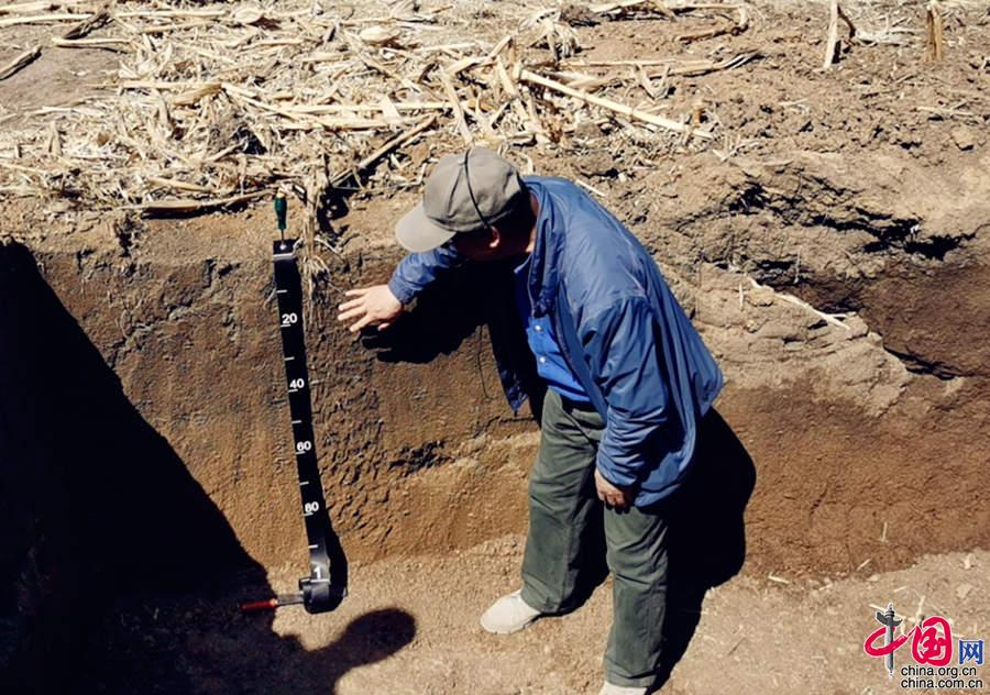 5月11日,探访中国科学院“黑土粮仓”科技会战“梨树模式”示范区。图为中国科学院沈阳生态所研究员张旭东在示范区基地介绍黑土地地下分层情况。王振红摄