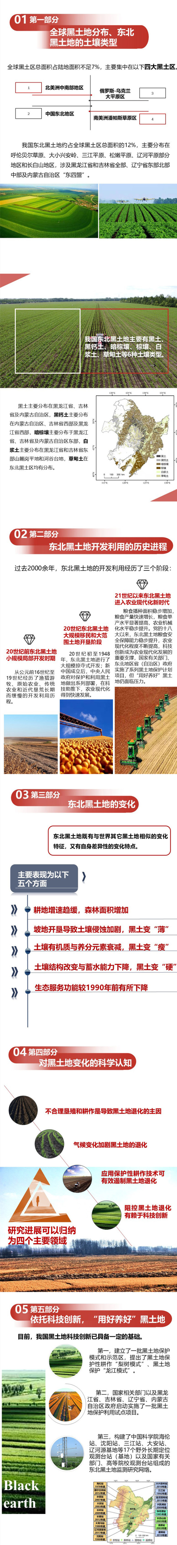 白皮书共分为五个部分。第一部分阐述了全球黑土地分布、东北黑土地的土壤类型;第二部分为东北黑土地开发利用的历史进程;第三部分为现阶段东北黑土地的变化;第五部分为依托科技创新,“用好养好”黑土地。未来“用好养好”黑土地研究的重点方向主要为五个方面:构建黑土地科技创新基础科技平台,摸清黑土地本底状况,提升科技支撑能力;建立黑土地保护与利用科技创新体系,增强区域自主创新能力;打造黑土地保护科技攻关样板,推进黑土地高质量发展;完善黑土地保护与利用技术标准体系,引导保护利用发展方向;加强国际合作交流,积极参与全球黑土地保护与利用治理。