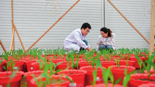 8月2日,吉林省梨树县四棵树乡三棵树村“科技小院”,中国农业大学博士研究生沙野(左)和在读硕士郭雯清观察玉米样本 张楠摄 / 本刊
