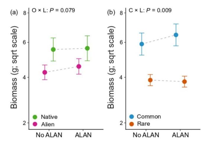 在有无夜晚光照处理下,外来种和本地种(a)、以及常见种和稀有种(b)的生物量。 中科院东北地理所 供图
