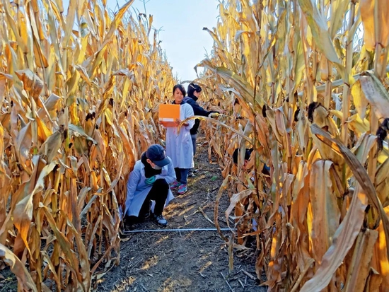 中科院沈阳应用生态研究所张旭东研究员团队成员在保护性耕作研发基地测玉米产量。