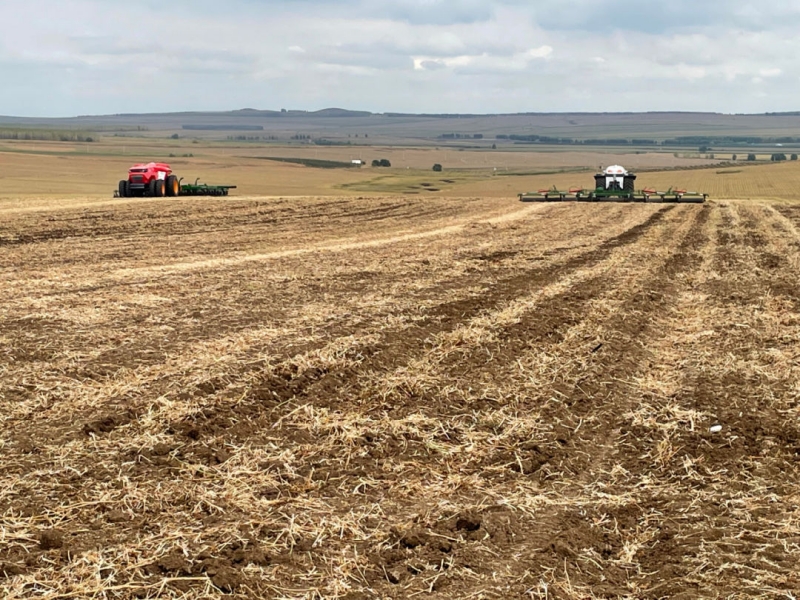 9月17日,无人驾驶的鸿鹄T300(左红色)搭载液压圆盘重耙驰骋在一望无际的大河湾农牧场惊艳亮相。右边,是无人驾驶的鸿鹄T150机头带着“伽马能谱土壤养分快速检测仪”,后边是镇压机。