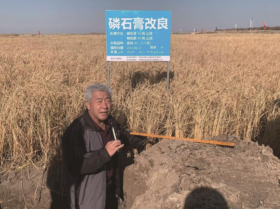 测产要通过收割、丈量、称重、除水、去杂等严格程序。首先进行的收割机进行收割,记者注意到通过土壤改良的稻田地里稻子长势喜人,在同一块地没有经过土壤改良的稻叶已经枯萎。通过土壤剖面可以清晰地看到,改良的盐碱地泥土发生了巨大变化,稻子根系已经扎得很牢固。而没有经过改良的稻田地土壤依然白花花一片。通过测产组测产,利用酸性磷石膏改良的重度盐碱地(改良前土壤pH10.58.EC0.42mS/cm)水稻产量达到每亩517.39公斤,而未实施土壤改良的水田产量仅为每亩35.16公斤,增产高达13.7倍。按此推算,每改造1000亩盐碱地即可增产粮食100万斤以上。
