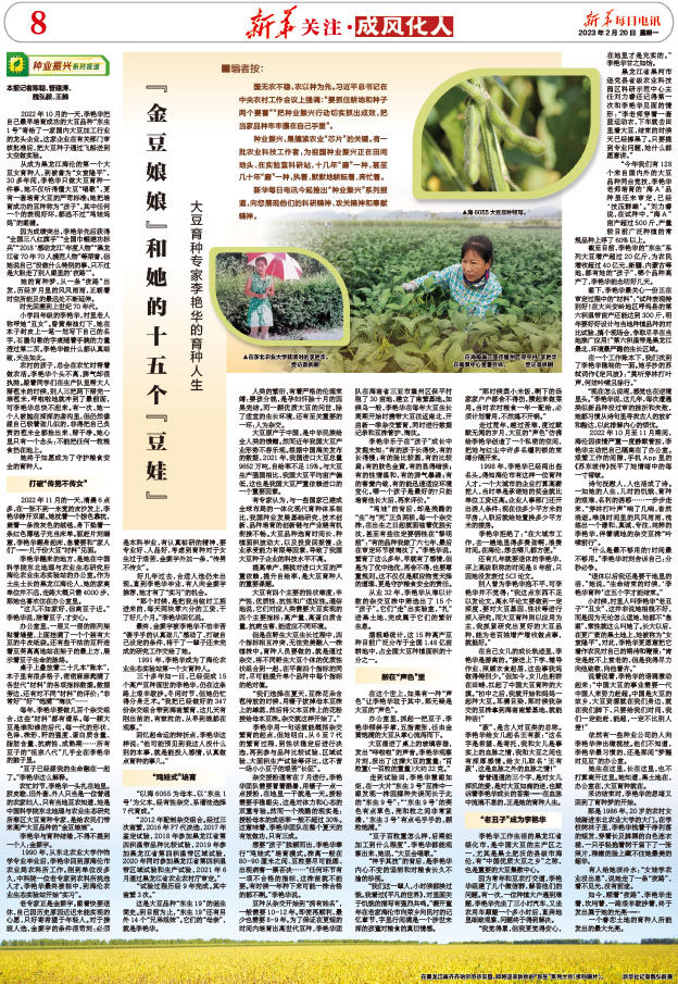 诗句抚慰人,人也活成了诗。一如她的人生,儿时的饥饿、育种的艰难、名利的诱惑……一步步走来,“穿林打叶声”响了几响,杳然消逝。唯独时间里的风风雨雨,洗练出一个谦和、真诚、专注、纯粹的李艳华,伴着满地的杂交豆株“吟啸前行”。