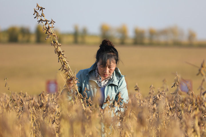 农忙时节,李艳华一头扎在地里。胶皮鞋、旧外套,外人只当是一位普通的农家妇人,只有当地豆农知道,她是中国科学院东北地理与农业生态研究所寒区大豆育种专家,是给农民们带来高产大豆品种的“金豆娘娘”。