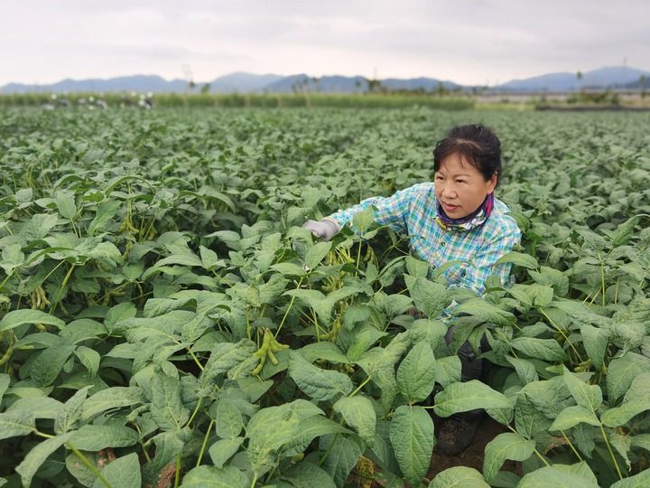 在黑龙江省齐齐哈尔市依安县太东乡,李艳华在田里查看豆株。受访者供图