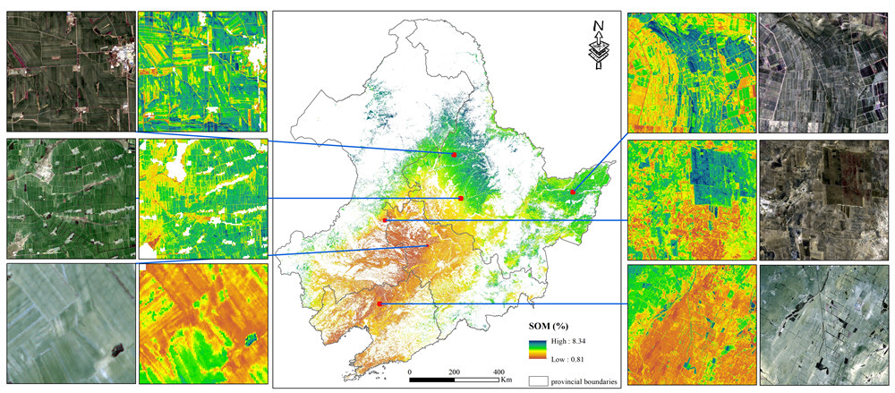 据了解,土壤有机质(SOM)含量是衡量土壤肥力高低的重要指标之一。土壤有机质是黑色的,有机质含量越高,土壤颜色越深,其遥感光谱反射率越低。高精度测量SOM含量空间分布图,对获得土壤质量评价与区域碳循环评估的精度有很大影响。