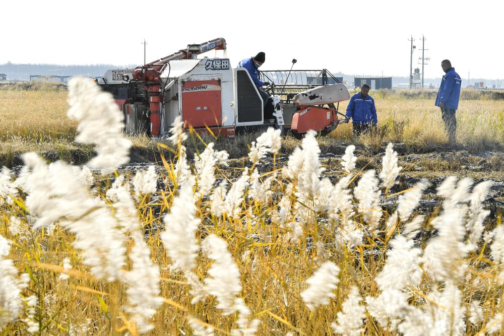 在大安市海坨乡盐碱地生态修复治理示范基地,农民驾驶收割机收割水稻(2022年10月12日摄)。新华社记者 许畅 摄