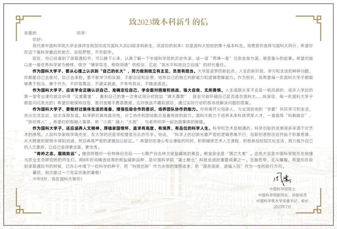 在致2023级本科新生的信中