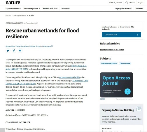 作为城市的重要组织部分,城市湿地在水源供给、增湿降温、雨洪调蓄等多个方面发挥着极其重要的作用,2024年国际湿地日主题定为“湿地与人类福祉“。在此背景下,中国科学院东北地理与农业生态研究所(下称“中国科学院东北地理所”)毛德华研究员等在12月5日出版的Nature发表题为“Rescue urban wetlands for flood resilience”的通讯文章(Correspondence),总结城市湿地在抵御气候变化危害、提升人类福祉方面的重要性及城镇化过程中城市湿地损失的严峻问题,提出保护城市湿地的倡议。中国科学院东北地理所为第一署名单位。