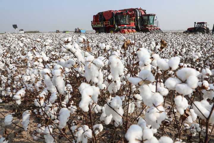 2023 年 10 月 22 日,黄河三角洲盐碱地棉花机采作业忙 朱峥 / 摄