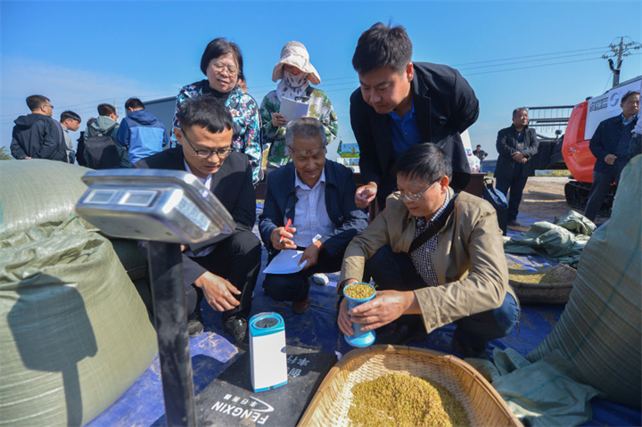 2020 年 9 月 27 日,专家和工作人员在内蒙古兴安盟袁隆平院士工作站盐碱地水稻基地进行测产,亩产稻谷再破千斤 徐钦 / 摄
