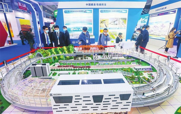 第十三届中国—东北亚博览会科技创新主题展区,中外展商向观众展示最新科技成果、最时尚互动体验和最潮流技术运用。图为参观者对中国中铁铁路接触网供电系统演示沙盘产生浓厚兴趣。(吉林日报记者 石雷 摄)
