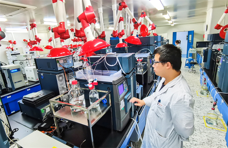 作为“长辽梅通白延医药健康产业走廊”的双核之一,长春市全力助推医药健康企业创新发展,一批高科技企业步入高质量发展轨道。图为金赛药业工作人员在高效液相色谱检验室对产品进行检验。(吉林日报记者 石雷 摄)