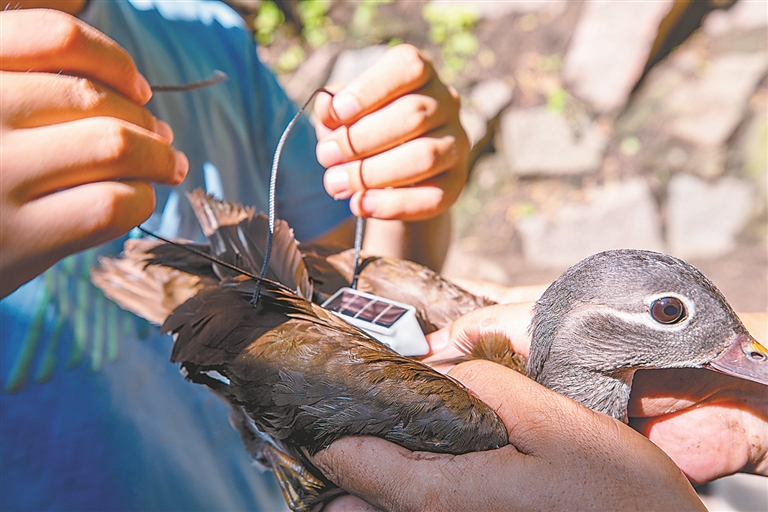 【龙头新闻】生活报命名的鸳鸯“滨滨”戴上卫星追踪器啦!