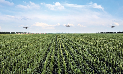 “梨树模式”百万亩核心绿色玉米生产基地无人机飞防。