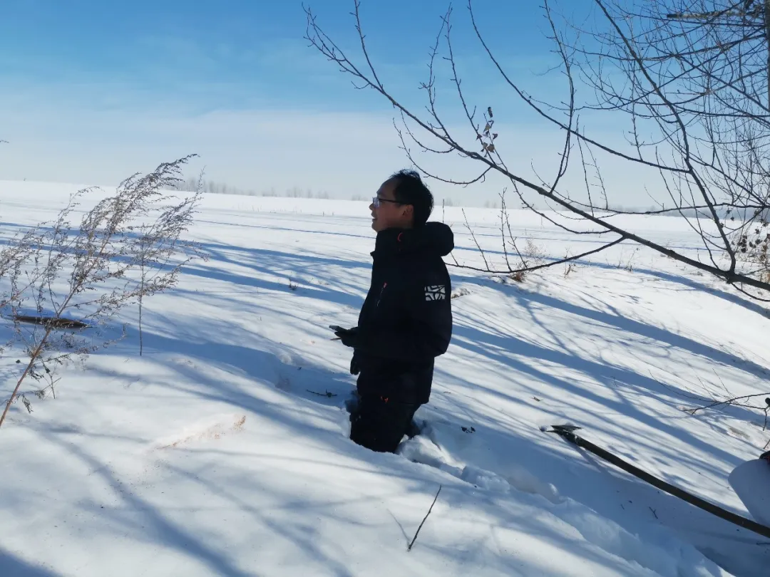 ▲东北地理所特别研究助理郭明明在海伦市光荣村开展汇水区积雪量空间异质性测量工作,连续在-10℃环境下工作10天以上