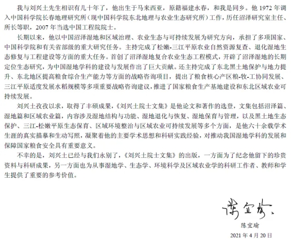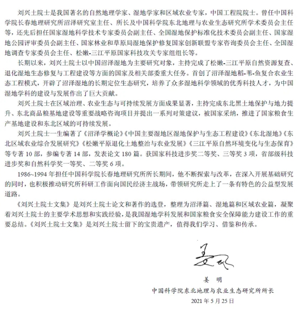 刘兴土院士多年来一直致力于湿地自然过程与机理的基础研究,首创了沼泽湿地稻-苇-鱼复合农业生态工程模式,倡导粮食核心产区粮-牧-工协同发展,提出保护东北黑土地和大豆玉米带、适度发展三江平原水稻种植规模等非常具有前瞻性的观点。