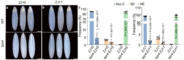 研究团队发现了水稻无胚性状的关键调控基因OsBZR4.在不同栽培品种中突变该基因,均可产生60%至100%的无胚种子。在这些无胚种子中,原本由胚占据的空腔被胚乳组织完全填充。