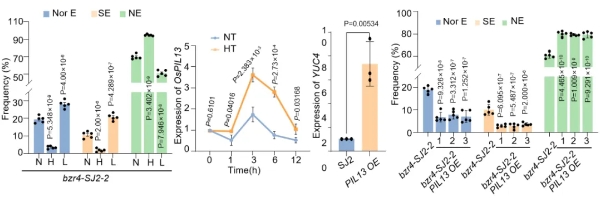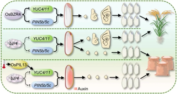 深入研究显示,高温能够诱导植物光敏色素互作因子(PIF)家族基因OsPIL13的表达,而OsPIL13又能激活生长素合成基因YUC4的表达,从而加剧OsBZR4功能缺失突变体中生长素的过度积累,最终导致产生更高比例的无胚种子。