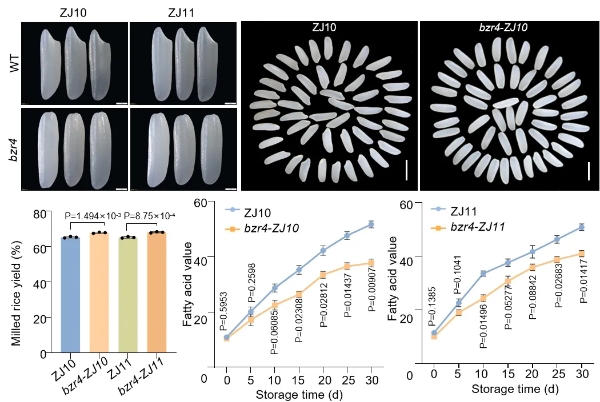 研究团队将OsBZR4功能缺失等位突变导入优质粳稻品种“中嘉10”和“中嘉11”。结果显示,这两个新品系的农艺性状与野生型相当,而精米率分别提高了2.52%和2.57%。