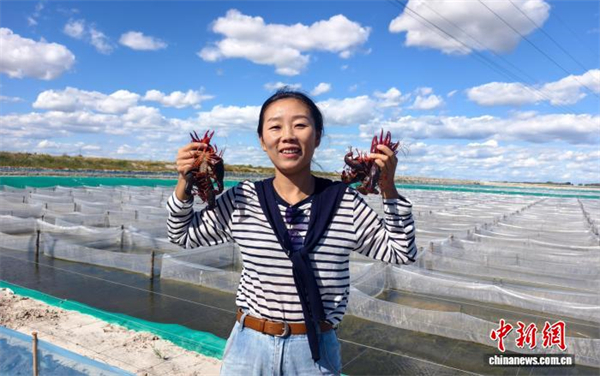9月9日,吉林大安,王秋举展示盐碱地里养殖的小龙虾。 中新社记者 郭佳 摄