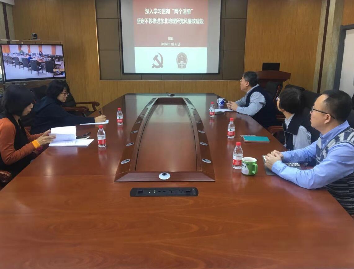 党委书记苏阳作题为《深入学习贯彻“两个清单” 坚定不移推进东北地理所党风廉政建设》的报告,带领与会人员围绕党建工作责任清单6个方面26条内容,党员干部廉洁自律负面清单30条内容进行逐条研读,分析其制定的目的与意义。