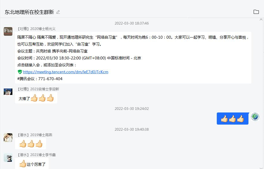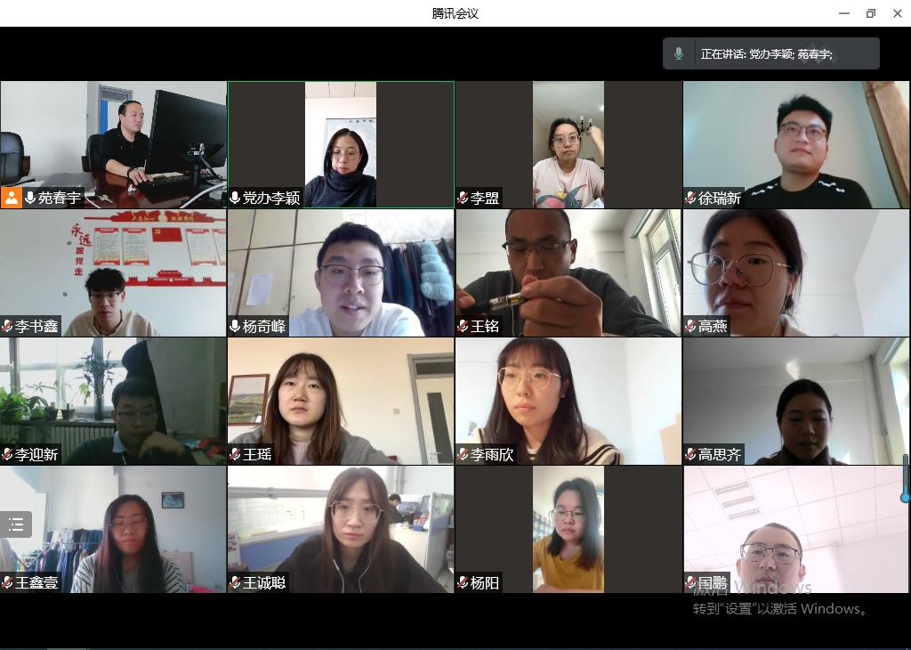 筹备组成员围绕如何做好党支部换届准备工作、封闭期间如何营造学习氛围、建立互助共享平台、防火安全、疫情防控等内容开展充分讨论。在讨论过程中,李颖、苑春宇与同学们积极互动,充分交流,对大家的意见建议给予肯定,并将“网络自习室”和“互助共享平台”等相关工作落实到人,确保快速落地。