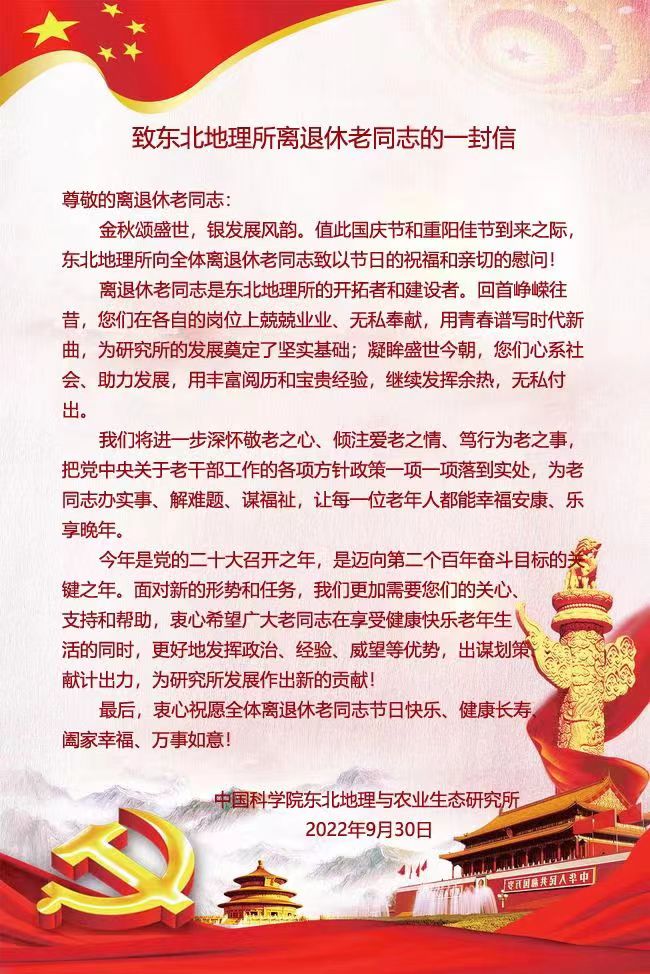 金秋十月,神州大地天清气朗,山河锦绣。中国共产党第二十次全国代表大会在举世瞩目中圆满完成各项议程和崇高使命,历时7天胜利闭幕。这是一次举旗定向、凝聚力量、团结奋进的大会,在党和国家发展进程中具有极其重大的历史意义。东北地理所作为国家战略科技力量,深入理解和准确把握党的二十大提出的各项工作部署至关重要。所党委从迎接党的二十大到学习宣传贯彻党的二十大精神都做出了明确的部署和具体的安排。针对离退休干部队伍的特点,东北地理所组织开展形式多样的活动,迎接党的二十大和学习宣传贯彻党的二十大精神,切实引领离退休干部感党恩、听党话、跟党走,为党的事业传播好声音、汇聚正能量、作出新贡献。