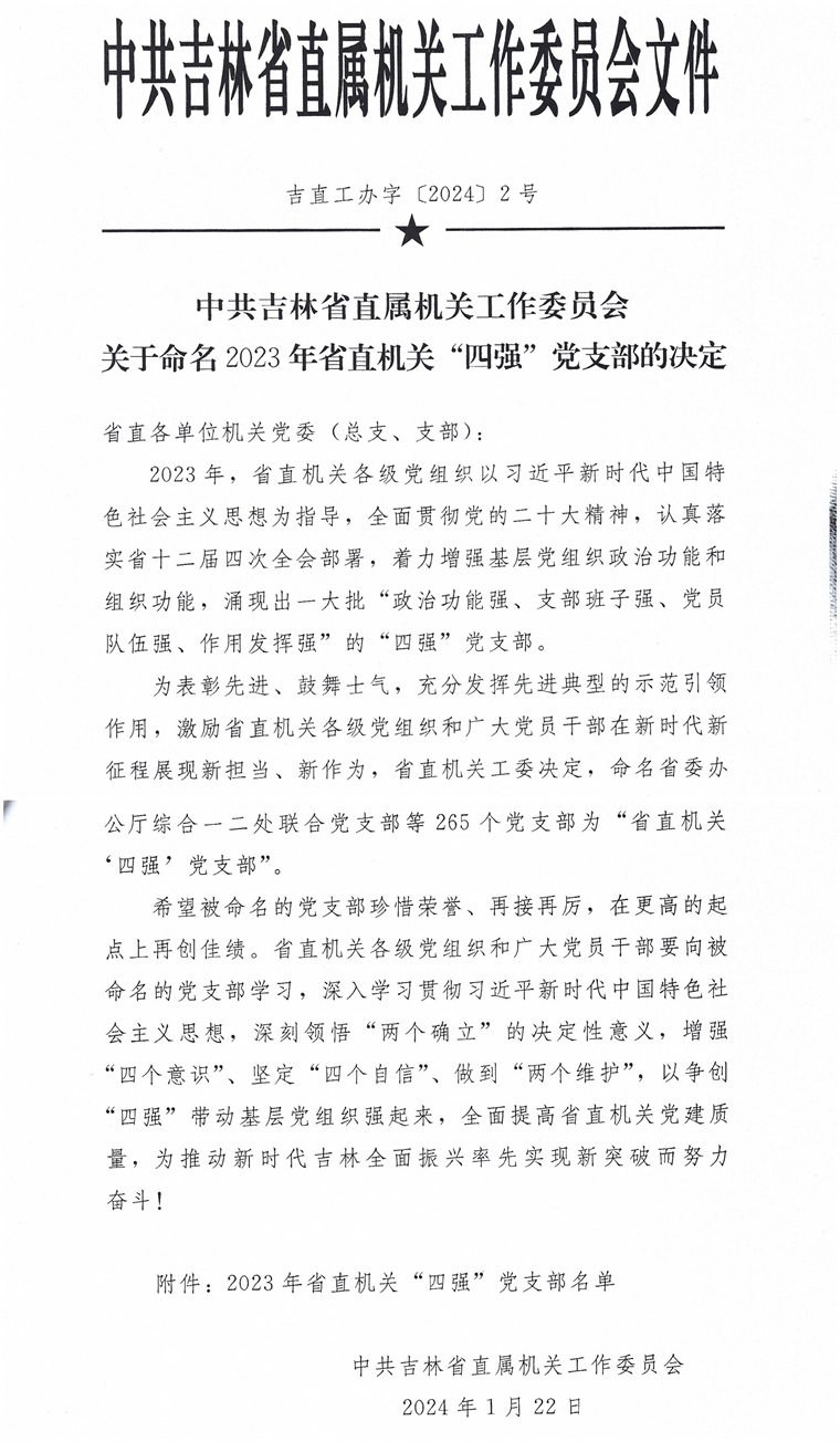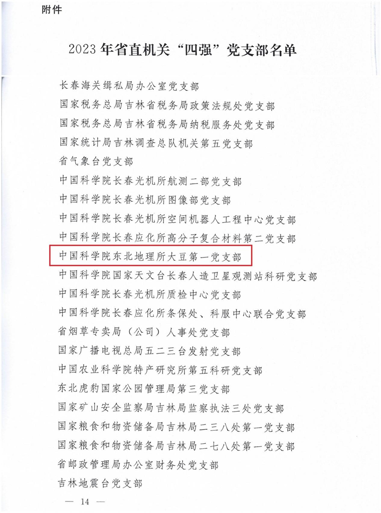 吉林省直机关工委为表彰先进、鼓舞士气,充分发挥先进典型的示范引领作用,激励省直机关各级党组织和广大党员干部在新时代新征程展现新担当、新作为,共命名265个党支部为“省直机关‘四强’党支部”,东北地理所大豆第一党支部位列其中。