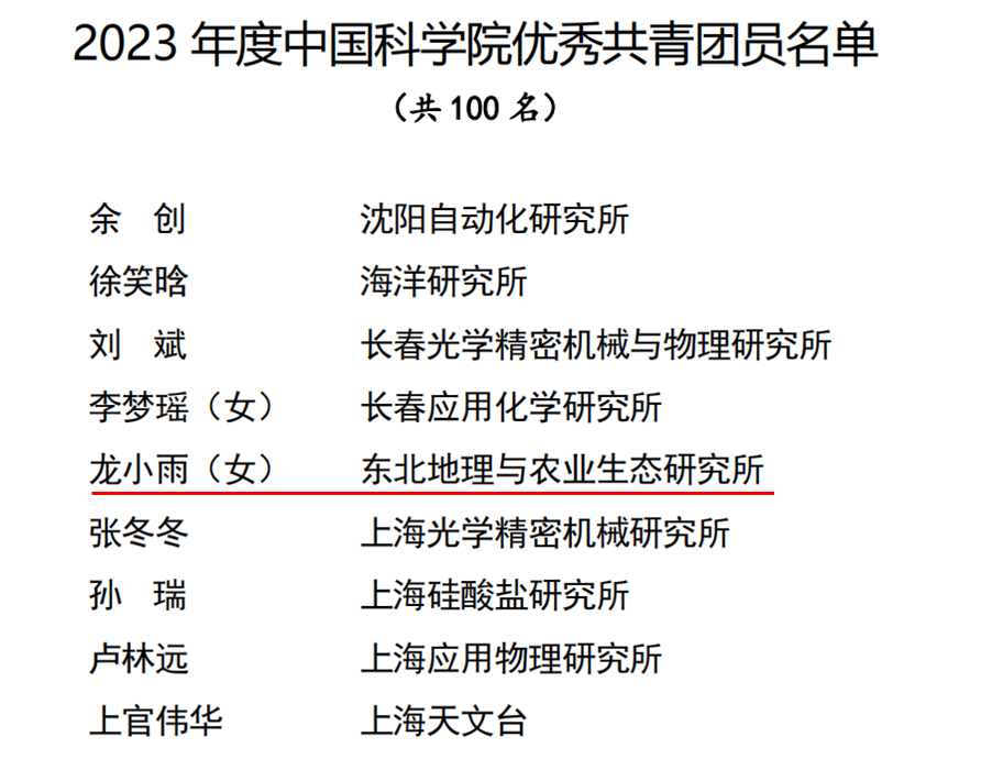 为表彰先进、树立典型,激励团青组织和广大团员、团干部奋勇争先、再创佳绩。近日,中国科学院团委发文对30个五四红旗团委、30个五四红旗团支部、50名优秀共青团干部、100名优秀团员青年进行表彰。中国科学院东北地理与农业生态研究所团委荣获“2023年度五四红旗团委”称号、2023级博士研究生龙小雨荣获“2023年度中国科学院优秀共青团员”称号。