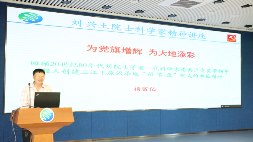 在刘兴土院士科学家精神讲座环节,特邀杨富亿研究员以《为党旗增辉 为大地添彩》为题作报告。他以“稻-苇-鱼”模式创建过程为线索,讲述刘兴土院士等老一辈科学家、老党员带领一批年轻人创建“稻-苇-鱼”模式的故事,分享身边人的感人故事,讲述一个个鲜活的事例,展现了科研工作者脚踏实地、无私奉献的伟大精神,全所职工、研究生备受鼓舞。