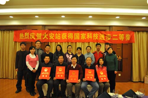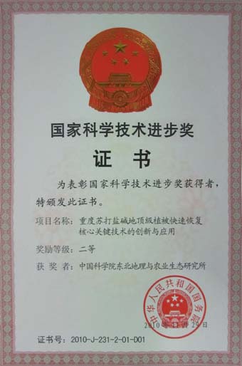 2011年1月14日,2010年度国家科学技术奖励大会在人民大会堂隆重举行。由中国科学院东北地理与农业生态研究所为第一完成单位,吉林省碱地生态经济工程实验室(第五)和大安碱地生态试验站(第七)等七家单位共同参与完成的科研成果“重度苏打盐碱地顶级植被快速恢复核心关键技术的创新与应用”喜获2010年度国家科技进步二等奖。我所梁正伟研究员代表项目组获奖人员出席了奖励大会,得到了胡锦涛总书记、温家宝总理、以及中共中央政治局常委李长春、习近平、李克强等党和国家领导人的亲切会见并合影留念。