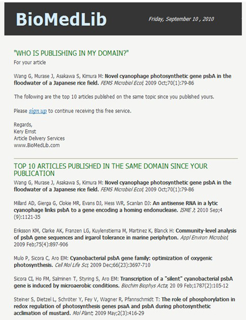 BioMedLib是生物医学科技搜索引擎。在MEDLINE数据库发表的上亿篇生物医学科技论文中,自动评测出相关领域中发表的十大最佳论文(Top 10 Articles Published in the Same Domain Since Your Publication)。我所王光华研究员于2004年发表在《应用生态学报》上论文“Antibiotics production by bacterial agents and its role in biological control”(2004, 15:1100-1104)和2009年发表在FEMS Microbiology Ecology上的论文“Novel cyanophage photosynthetic gene psbA in the floodwater of a Japanese rice field” (2009, 70:79-86)最近被评为同领域研究十大最佳论文。
