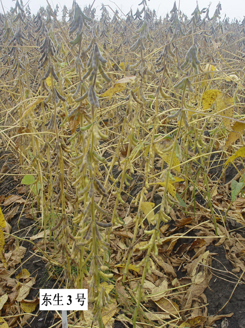 “东生3号”特征特性:该品种平均生育期119天,长叶、紫花、亚有限结荚习性。株高87.6厘米,单株有效荚数36.6个,百粒重19.7克。籽粒圆形,种皮黄色,黄脐。接种鉴定,中抗大豆灰斑病,中抗SMVⅠ号株系,感SMVⅢ号株系。粗蛋白质含量40.07%,粗脂肪含量20.54%。