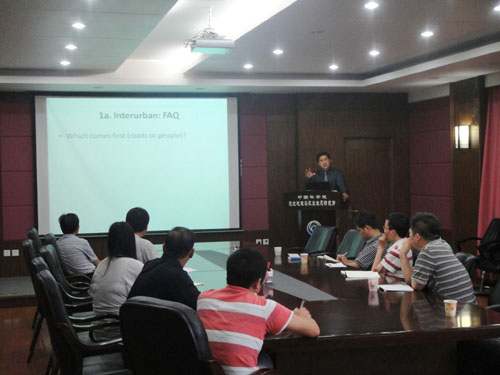 6月29日,王法辉教授作了题为“Transport Networks and Human Settlement: A Sino-US Comparative Perspective”的学术报告。针对交通网络与城市系统的作用关系,报告从将城市作为“点”和“面”的两个层面展开,分别阐述了交通网络对城市之间和城市内部空间关系的影响。特别突出了复杂网络分析和手机通信流量、基于GPS的出租车运行轨迹等新方法新数据的应用。以中国铁路与航空网络、美国巴吞鲁日、西班牙巴塞罗那以及中国青岛、上海的相关研究成果为案例,王法辉教授详细解释了各类方法在交通网络与城市系统研究中的运用,以及研究结论回答了哪些城市地理研究的基本科学问题,比如交通与城市兴衰、城市内部的最优区位等。报告并从中美比较的角度,提出了未来研究方向。报告内容引起了参会人员的热烈讨论,王法辉教授就大家提出的数据获取、研究方法应用如何选择尺度、地理学科内部交流合作等问题进行了详细解答。