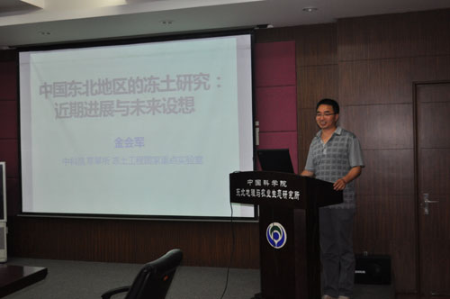 金会军从东北地区冻土研究的研究历史、主要研究进展和下一步研究设想三方面向大家做了深入细致的介绍。报告结束后,相关科研人员就冻土监测方法、土地利用情况变化、冻土与水文变化的关系等问题与金会军做了深入的交流和探讨,他都一一做了解答。他认为,地学是东北地理所的传统优势学科,研究所在开展东北地区研究上又有着得天独厚的优势,他希望双方能在相关交叉学科上共同开展研究。黄铁青表示,希望双方能在东北冻土、湿地、森林、人类活动相互作用方面开展深入研究,促进学科的发展,为东北地区经济社会发展提供科技支撑。