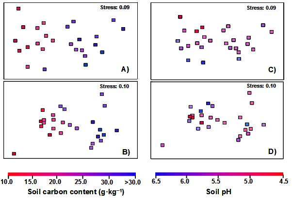图1 东北黑土农田真菌群落结构的NMDS分析。图A和C及图B和D是基于unweighted和weighted UniFrac群落分析结果