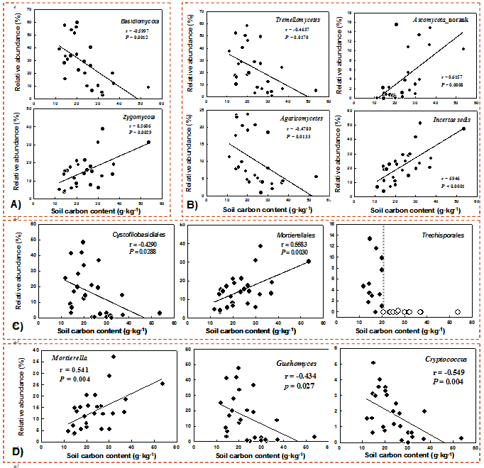 图2 黑土农田真菌在门(A)、纲(B)、目(C)和属(D)上的相对丰度与土壤全碳含量间的关系