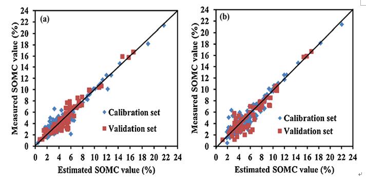 图 2实测的土壤有机质含量与估算的土壤有机质含量之间的关系:(a)GRA-ANN方法和(b)ANN方法。