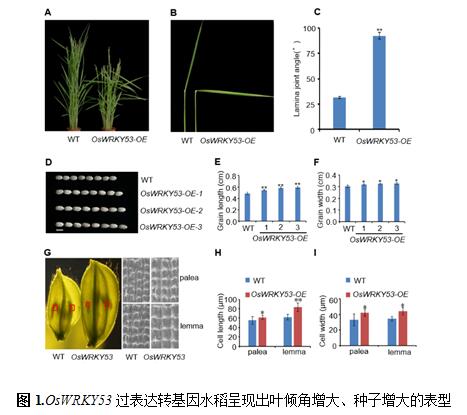 总之,本研究揭示了水稻转录因子OsWRKY53能够正向调控BR信号和水稻株型,这一发现不仅丰富了BR信号转导通路,而且挖掘了OsWRKY53未被报道的生物功能,对不同激素之间信号识别、信号交流和信号转导提供新的研究思路和研究视角,具有重要的理论和应用价值。