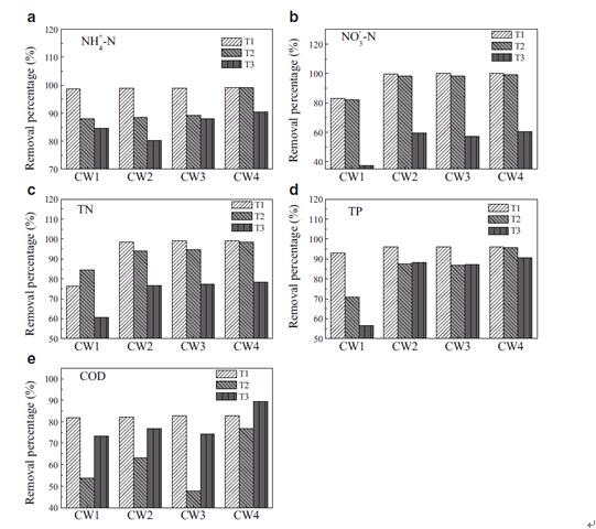 图1栽种不同植物的水平潜流人工湿地在不同环境温度下的净化效果(CW1:无植物对照; CW2:美人蕉;CW3:千屈菜;CW4:美人蕉与千屈菜混种)