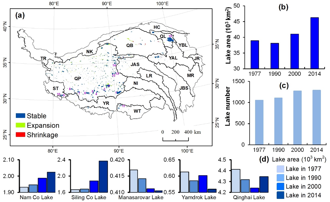 湖泊是气候变化的重要指示因子,通过探讨湖泊的变化及其对气候变化的响应,有助于理解区域水循环,并为流域水资源管理提供重要的科学决策依据。作为全球第三极的青藏高原,是我国湖泊的第一大分布区,素有“亚洲水塔”之称,其变化及其原因(气候变化、冰川融化、冻土退化)一直是国际青藏高原研究学者关注的热点。青藏高原湖泊变化不仅对生态环境产生重要的影响,而且还会影响到区域历史宗教文化(如圣湖的变化)。尽管已有一些学者报道了区域湖泊的面积变化特征,但长时间序列的气候变化对青藏高原湖泊影响的格局与过程尚不明确。