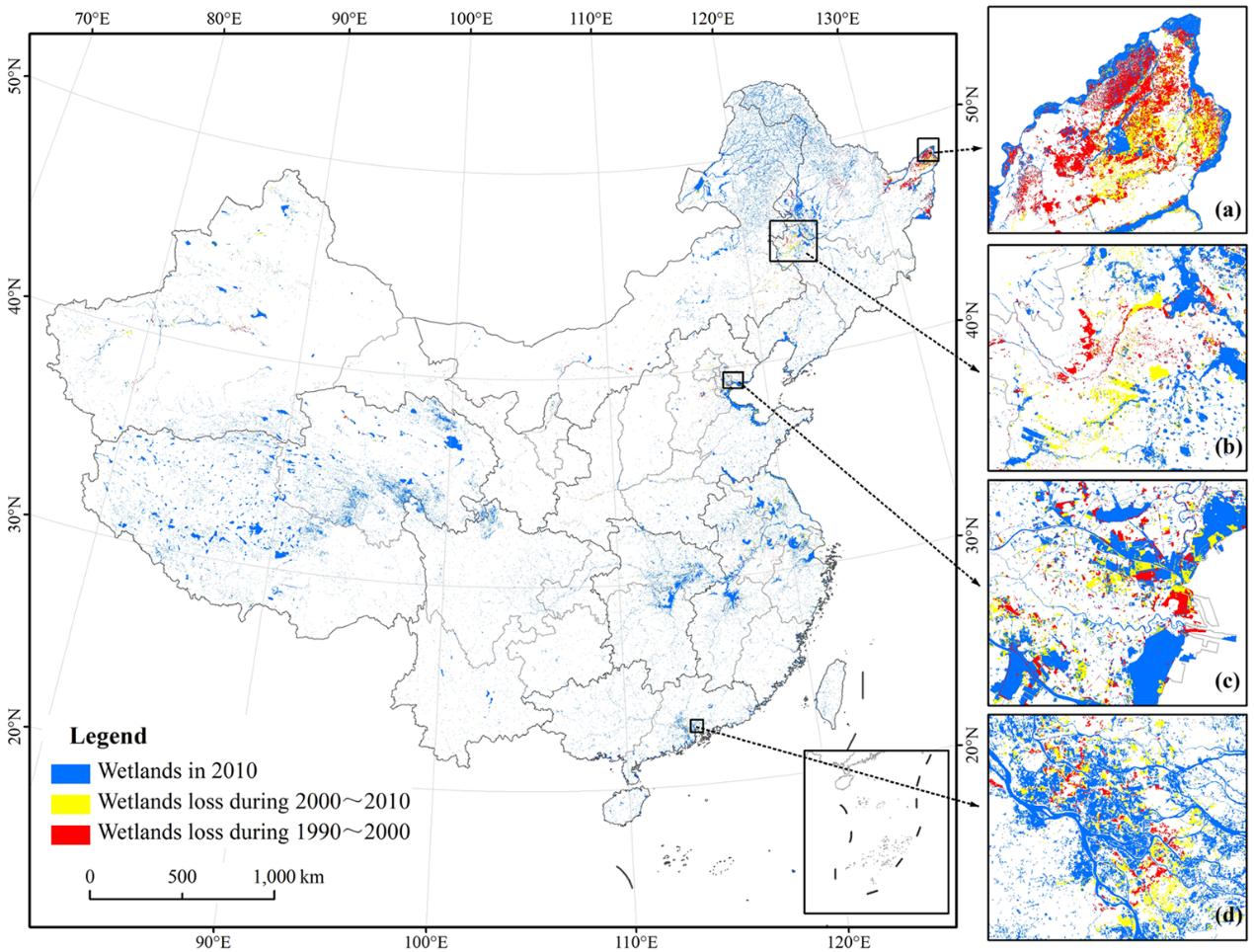 东北地理所地理景观遥感学科组研究人员利用中国科学院建设完成的中国土地覆被数据库(ChinaCover;吴炳方等,2017)中1990、2000、2010年三期城镇用地和湿地数据,系统探讨了1990-2010年期间中国城镇用地扩张和湿地损失的时空格局,并进一步分析了城镇化直接占用湿地的数量、格局及其地理分布差异;对比了ChinaCover湿地数据与我国国家尺度上已有的湿地调查或遥感估算的结果。