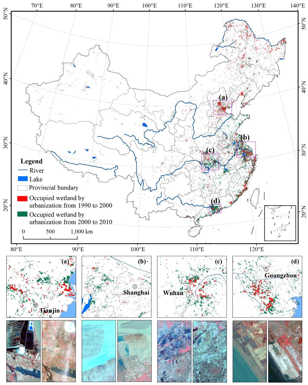图2 1990-2010年中国城镇用地扩张占用湿地的空间格局及遥感影像示例