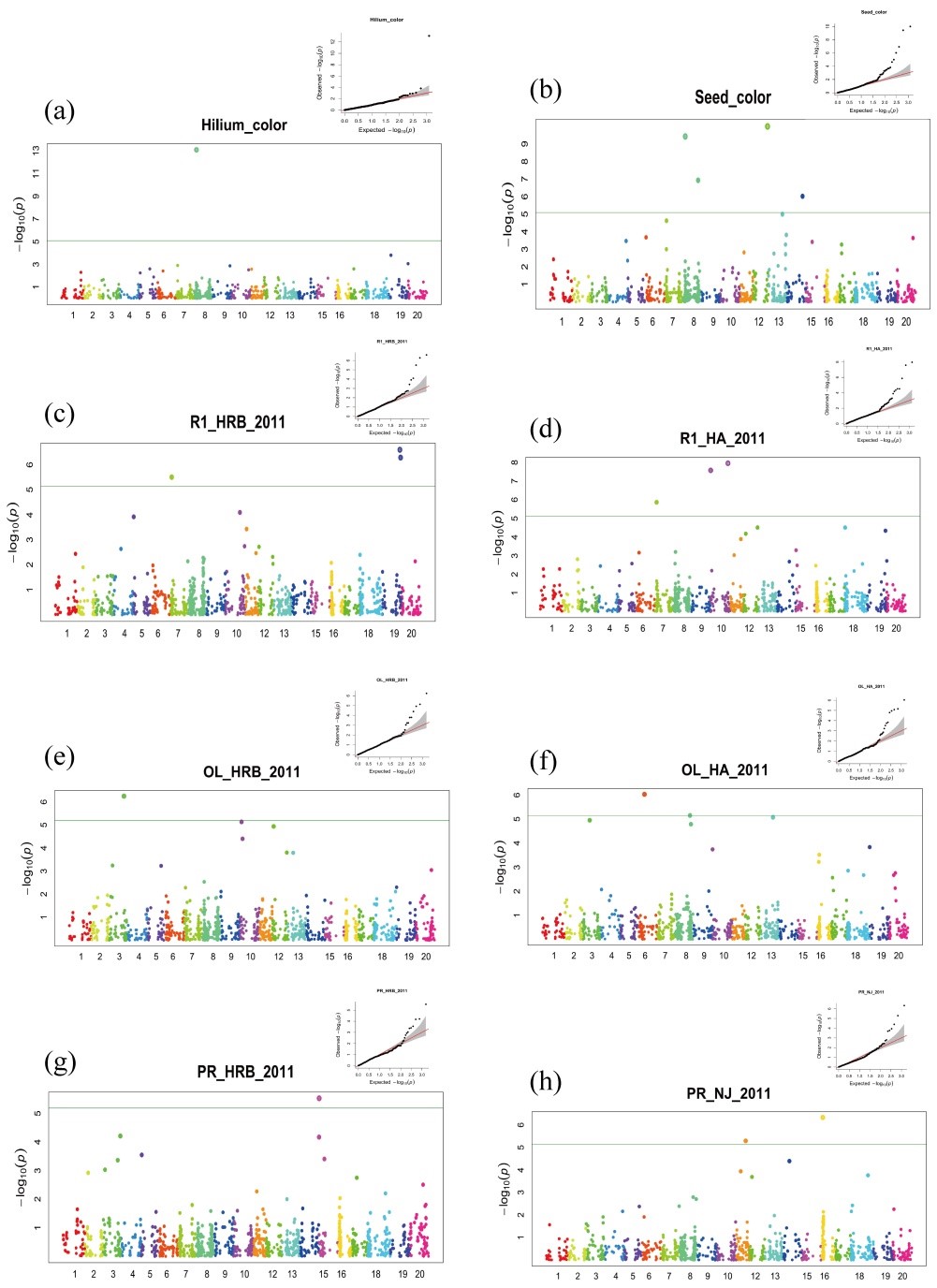 图2.种脐颜色,种皮颜色,开花时间(R1),种子蛋白含量,油分含量的GWAS分析图。