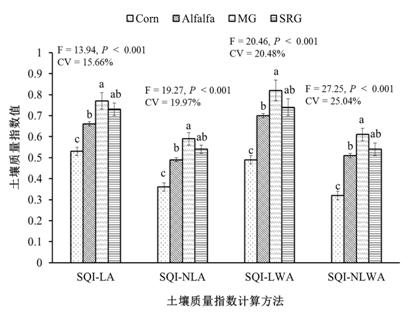 进一步的研究表明,松嫩碱化草地土壤质量评价的最小数据集中包括蔗糖酶活性、N:P、可溶性有机碳含量和不稳定有机碳含量 4个土壤指标。4个土壤质量指数均能准确的反应出土地利用方式对土壤质量的影响,但由于SQI-NLWA在不同土地利用方式间的差异更明显,变异性更大,能更敏感的反映出土地管理措施的影响,因此更适合研究区内土壤质量的评价。苜蓿地、羊草地和自然恢复草地中土壤质量指数均较高,表明草地恢复显著改善了研究区内的土壤质量。