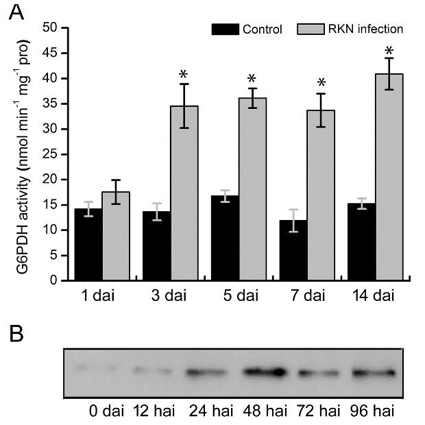 图1 线虫侵染导致G6PDH酶活及蛋白含量升高