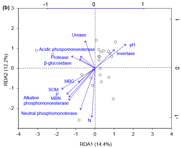 图2 细菌(a)和真菌(b)群落结构与土壤性质的RDA分析