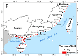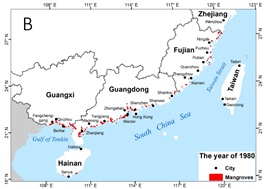 红树林是生长在热带、亚热带海岸潮间带或河流入海口的木本植物群落,具有防风消浪、保护滩涂、净化海水和促淤造陆等重要作用,是国际上湿地生态保育和生物多样性保护的重要对象。然而近半个世纪以来,人类活动和自然环境的变化导致红树林资源急剧减少,全球35%的红树林在此期间消失。红树林不可取代的生态、经济、社会效益,以及面临着自然和人为双重胁迫下急剧锐减的严峻形势,使得红树林保护和管理越来越受到世界各国的重视。在中国,上世纪后50年红树林遭到严重破坏,其损失速率显著高于世界平均水平。自20世纪90年代中期开始,中国政府颁布了一系列红树林保护的法律和条例,但是关于红树林保护成效的研究甚少。特别是在国家尺度上,红树林保护的成效如何?各个保护区的建立是否起到了保护当地红树林的作用?等等相关问题还没有明确的答案。这些问题的解答对于制定合理的滨海湿地保护、恢复和资源利用政策意义重大,对于建设“美丽中国”这一生态文明目标的相关工作也具有重要的借鉴意义。